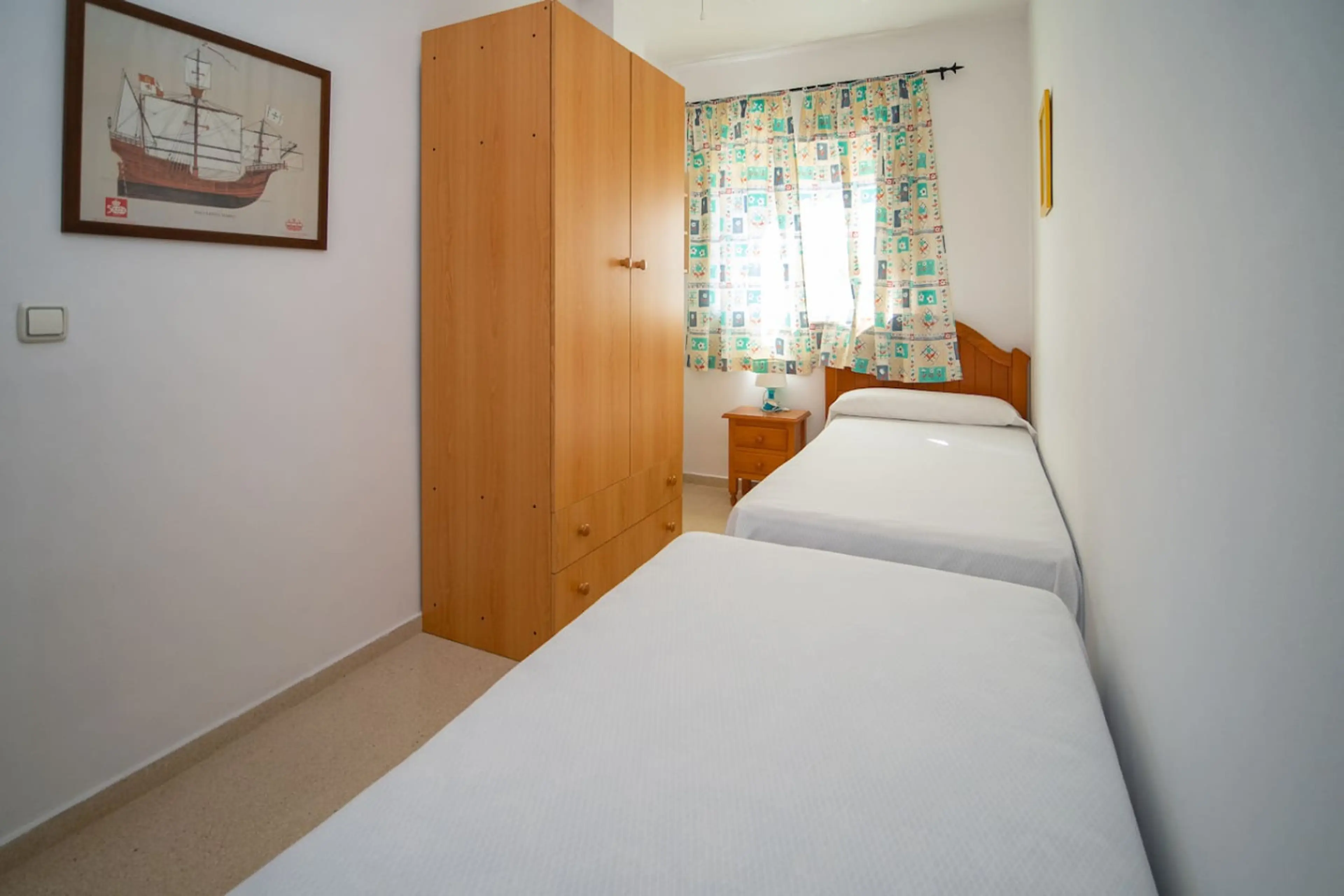 Apartamento con dos habitaciones y un cuarto de baño. Tiene una terraza muy grande, con vistas al mar. La playa está a solo 500 metros andando. Apagar el coche es fácil.